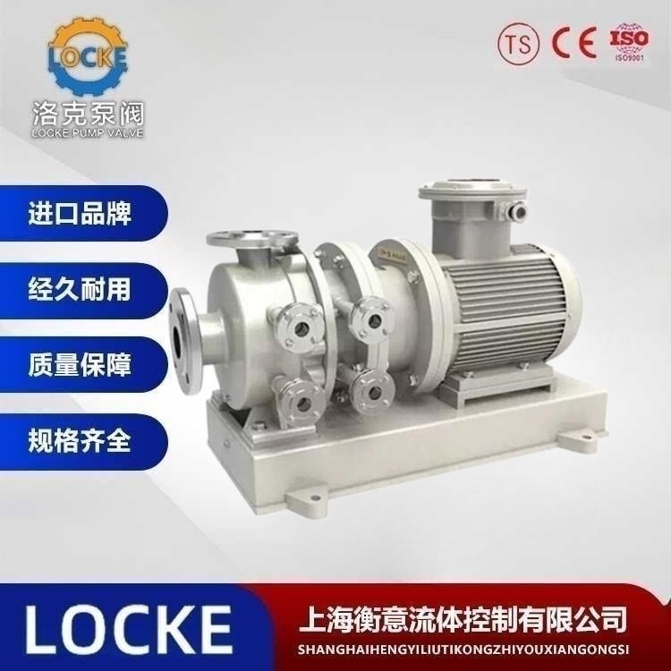 德国《LOCKE》洛克--进口无泄漏磁力高(保)温离心泵(简称:磁力高(保)温泵)是应用现代磁力学原理,利用永磁体的磁力传动实现扭矩的无接触传递的一种新型泵,就是电机带动外转子(即外磁钢)总成旋转时,通过磁场的作用磁力线穿过隔离套带动内转子(即内磁钢)总成和叶轮同步旋转,由于介质封闭在静止的隔离套内,从而达到无泄漏抽送介质的目的。泵体、泵盖设计了双层冷却(保温)装置,磁力高温泵可使用水、氮气进行可使用水、氮气等对泵体内介质冷却,确保进入泵内的介质保持在较低的温度,磁力保温泵加入蒸气对泵体内介质保温,保证了介质在输送过程中不会冷凝、结晶、气化,彻底解决了机械传动泵的轴封泄漏、冷凝、结晶、气化,彻底解决了机械传动泵的轴封泄漏、冷高温、气化,而设计的全密封、无泄漏、无污染、耐高温、保温、高效节能的新型工业用泵。性能达到国际标准。