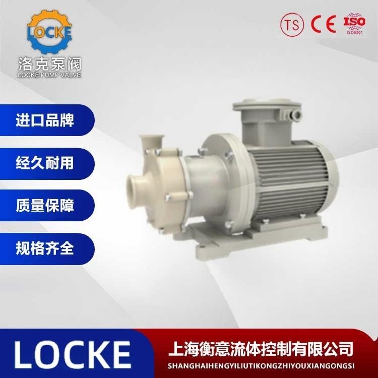 德国《LOCKE》洛克--进口无泄漏氟塑料磁力泵(简称:氟塑料磁力泵)是应用现代磁力学原理,利用永磁体的磁力传动实现扭矩的无接触传递的一种新型泵,也就是电机带动外转子(即外磁钢)总成旋转时,通过磁场的作用磁力线穿过隔离套带动内转子(即内磁钢)总成和叶轮同步旋转,过流部件全部采用氟塑料制造,可输送任意浓(强)度的酸、碱、氧化剂等腐蚀性介质,由于介质封闭在静止的隔离套内,从而达到无泄漏抽送介质的目的,彻底解决了机械传动泵的轴封泄漏,而设计的全密封、无泄漏、无污染、耐强酸、高效节能的新型无泄漏耐酸泵,性能达到国际标准、可替代价格昂贵不锈钢,特殊合金材料的化工泵。