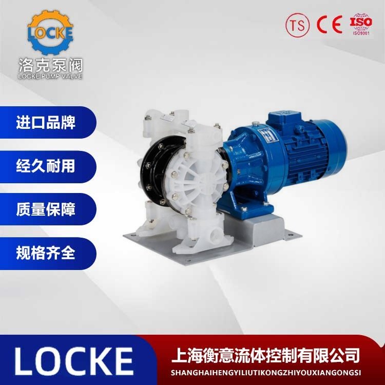 德国《LOCKE》洛克--进口氟塑料电动隔膜泵是一种新型的泵类,由于在隔膜材质上取得了突破性的进展,来应用于石化、陶瓷、冶金等行业,特点是不需灌引水,自吸能力强。电机通过减速箱带动左右两端柱塞上面的隔膜一前一后往复运动。在左右两个泵腔内,装有上下四个单向球阀隔膜的运动,造成工作腔内的容积的改变,迫使四个单向球阀交替地开启和关闭,从而将液体不断地吸入和排出。
