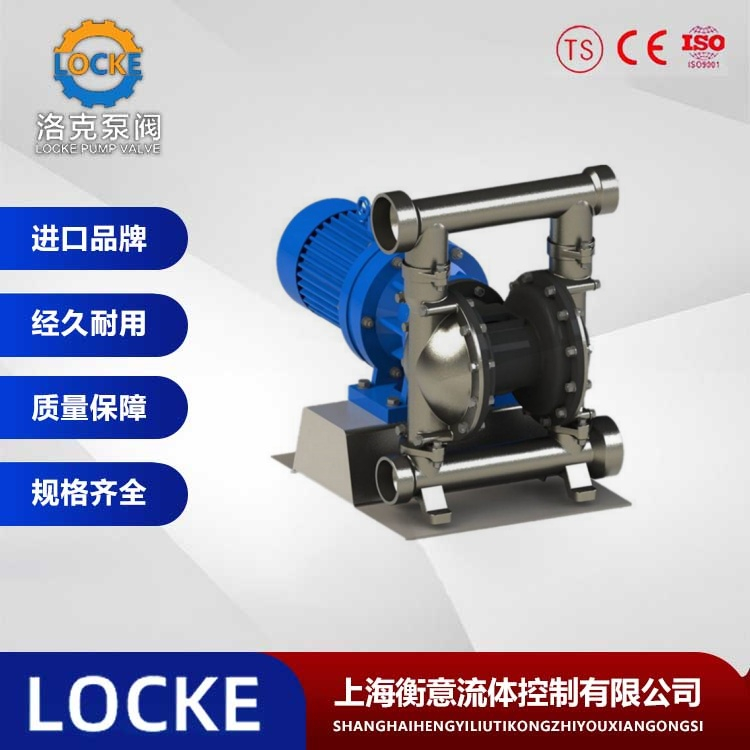 德国《LOCKE》洛克--进口铝合金电动隔膜泵是一种新型的泵类,由于在隔膜材质上取得了突破性的进展,来应用于石化、陶瓷、冶金等行业,特点是不需灌引水,自吸能力强。电机通过减速箱带动左右两端柱塞上面的隔膜一前一后往复运动。在左右两个泵腔内,装有上下四个单向球阀隔膜的运动,造成工作腔内的容积的改变,迫使四个单向球阀交替地开启和关闭,从而将液体不断地吸入和排出。