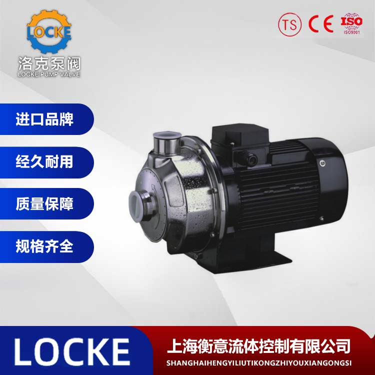 德国《LOCKE》洛克--进口轻型不锈钢卧式单级离心泵是一种卧式单级离心泵,该泵与电机采用直联式联接,整体结构非常紧凑美观,泵的过流部件全部采用304不锈钢材料,可耐轻度腐蚀,泵的主要零部件采用薄板冲压结构,具有重量轻的特点,泵配有螺纹进出水口,联接方便,是一款非常现代的泵。输送介质 稀薄、干净、非易燃易爆并不含固体颗粒和纤维的液体,可输送轻腐蚀性介质(与介质中氯离子含量、酸和碱的浓度、是否对橡胶和机械密封摩擦付材料产生腐蚀等情况有关),所输送介质的密度不能大于清水,粘度要接近于水。否则需配用大功率电机。