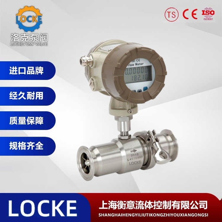 德国《LOCKE》洛克--进口卡箍式涡轮流量计由传感器和转换显示仪组成,传感器采用多叶 片的转子感受流体的平均流速,从而推导出流量或总量。转子的转整(或转数)可用机械、磁感应、光电方式检出并由读出装置进行显示和传送记录。