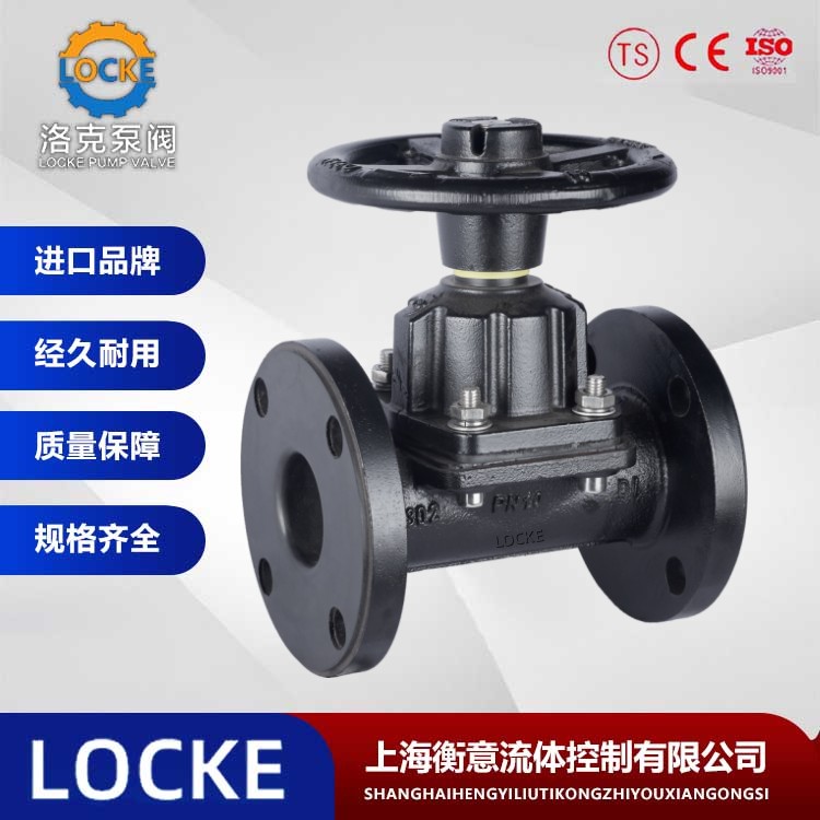 德国《LOCKE》洛克--进口直通式隔膜阀专用于控制非腐蚀性或一般腐蚀性介质,阀体内腔表面无衬里或覆有可供选择的各种橡胶、适用于不同工作温度和液体管路。本产品较突出特点是隔膜把下部阀体内腔与上部阀盖内腔隔开,使位于隔膜上方的阀杆、阀瓣等零件不受介质腐蚀,省去了填料密封结构,且不会产生介质外漏。