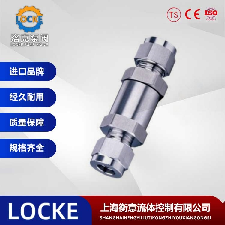 德国《LOCKE》洛克--进口高压单向阀是指采用不锈钢或者碳钢材质,采用整体锻造,弹簧作用,耐高压的单向阀,靠管路中介质本身的流动产生的力而自动开启和关闭的,属于一种自动阀门。单向阀用于管路系统,其主要作用是防止介质倒流、防止泵及其驱动电机机反转,以及容器内介质的泄放。焊接式单向阀只允许介质向一个方向流动,而且阻止方向流动。