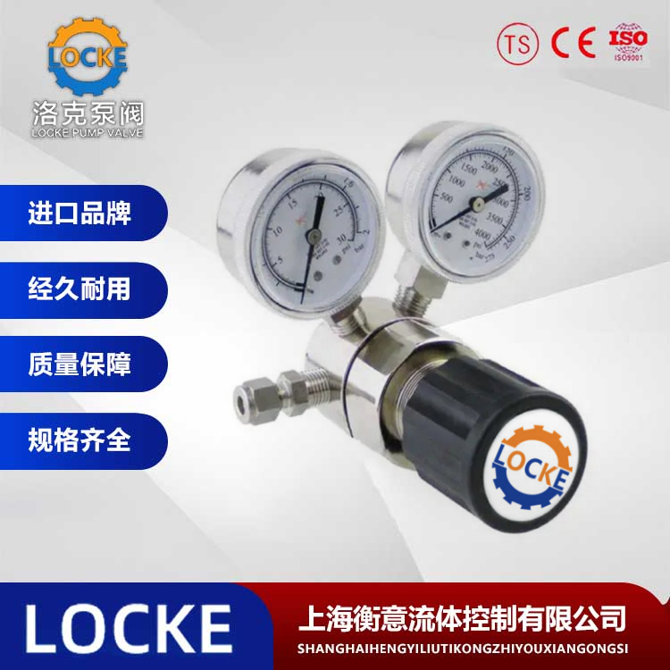 德国《LOCKE》洛克--进口氧气减压阀,也叫氧气瓶减压器,(oxygen cylinder pressure relief valve),就是指阀体采用去油脱脂的不锈钢材质,将氧气钢瓶中的高压气体减为实验及工况所需的低压气体压力的减压阀。采用活塞式减压结构,输出压力稳定,主要用于石油化工、化纤、照明电器、热处理、冶金、玻璃、食品、医药、电子、国防航天、航空等主导领域的氧气钢瓶的出口减压。氧气一般都是贮存在专用的高压气体钢瓶中,使用时通过减压阀使气体压力降至实验所需范围,再经过其它控制阀门细调,使气体输入使用系统。由于氧气气瓶内压力较高,而气焊和气割和使用点所需的压力却较小,所以需要用减压器来把氧气储存在气瓶内的较高压力的气体降为低压气体,并应保证氧气所需的工作压力自始至终保持稳定状态。进口氧气减压器是将高压氧气降为低压气体、并保持输出氧气的压力和流量稳定不变的调节装置。