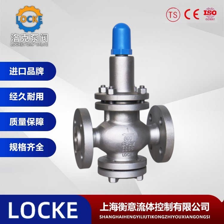 德国《LOCKE》洛克--进口油用减压阀由主阀和导阀两部分组成。主阀主要由阀座、主阀盘、活塞、弹簧等零件组成。导阀主要由阀座、阀瓣、膜片、弹簧、调节弹簧等零件组成。通过调节调节弹簧压力设定出口压力、利用膜片传感出口压力变化,通过导阀启闭驱动活塞调节主阀节流部位过流面积的大小,实现油品的减压稳压功能。