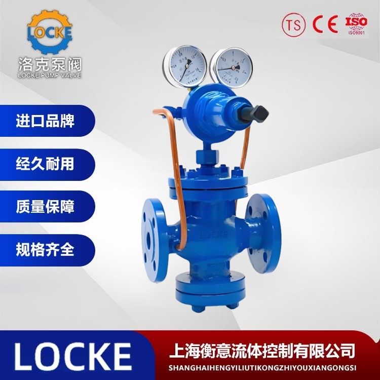 德国《LOCKE》洛克--进口液化气减压阀由主阀和导阀两部分组成。液化气减压阀主阀主要由阀座、阀盘、活塞、缸套、弹簧等零件组成。液化气减压阀的导阀主要由阀座、阀瓣、膜片、弹簧、调节弹簧等零件组成。通过调节调节弹簧压力设定出口压力,利用膜片传感出口压力变化,通过导阀启闭驱动活塞调节主阀节流部位过流面积的大小,实现减压稳压功能。液化气减压阀属于先导活塞式减压阀主要用于气体管路,适用于空气、氮气、氧气、氢气、液化气、天然气等气体。工作温度在-10°C.---80/150°C.之间。