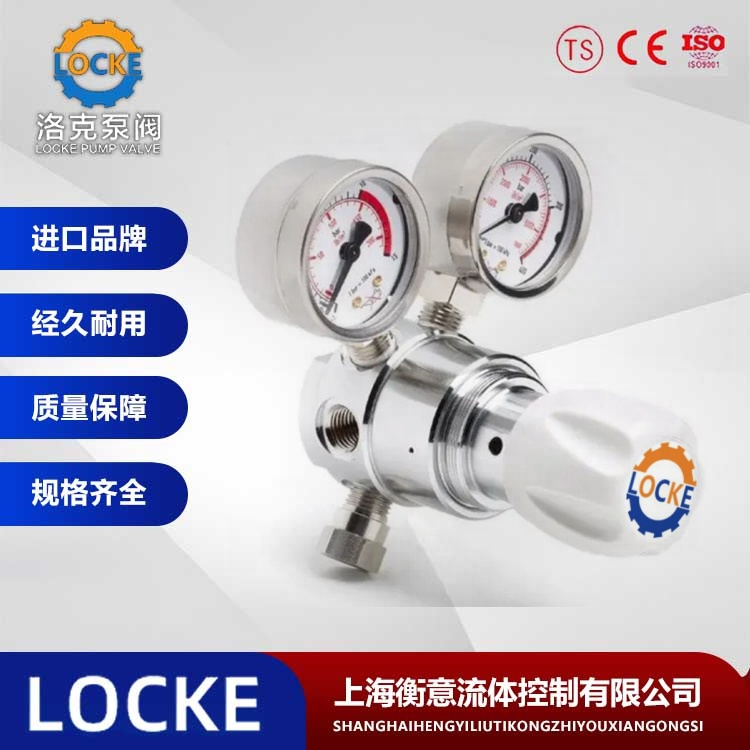德国《LOCKE》洛克--进口特气瓶减压阀,也叫特气减压器,Special gas reducing valve,就是将特气钢瓶中的高压气体减为实验及工况所需的低压气体压力的减压阀。采用活塞式减压结构,输出压力稳定,主要用于石油化工、化纤、照明电器、热处理、冶金、玻璃、食品、医药、电子、国防航天等主导领域的特气钢瓶的出口减压。特气一般都是贮存在专用的高压气体钢瓶中,使用时通过减压阀使气体压力降至实验所需范围,再经过其它控制阀门细调,使气体输入使用系统。由于特气气瓶内压力较高,而气焊和气割和使用点所需的压力却较小,所以需要用减压器来把特气储存在气瓶内的较高压力的气体降为低压气体,并应保证特气所需的工作压力自始至终保持稳定状态。进口特气减压器是将高压特气降为低压气体、并保持输出特气的压力和流量稳定不变的调节装置。