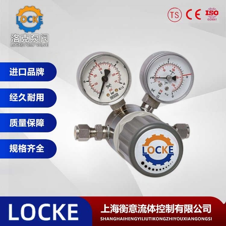 德国《LOCKE》洛克--进口小口径气体减压阀,小口径气体减压器,Small-diameter gas reducing valve,就是是口径为G1/4,1/2,5/8等小规格的气体减压阀,将气体钢瓶中的高压气体减为实验及工况所需的低压气体压力的减压阀。采用活塞式减压结构,输出压力稳定,主要用于石油化工、化纤、照明电器、热处理、冶金、玻璃、食品、医药、电子、国防航天等主导领域的氮气钢瓶,氧气钢瓶,氦气钢瓶,氢气钢瓶,氩气钢瓶,乙炔钢瓶的出口减压。各种气体一般都是贮存在专用的高压气体钢瓶中,使用时通过减压阀使气体压力降至实验所需范围,再经过其它控制阀门细调,使气体输入使用系统。由于气瓶内压力较高,而气焊和气割和使用点所需的压力却较小,所以需要用减压器来把储存在气瓶内的较高压力的气体降为低压气体,并应保证所需的工作压力自始至终保持稳定状态。进口小口径气体减压阀是将高压气体降为低压气体、并保持输出气体的压力和流量稳定不变的调节装置。