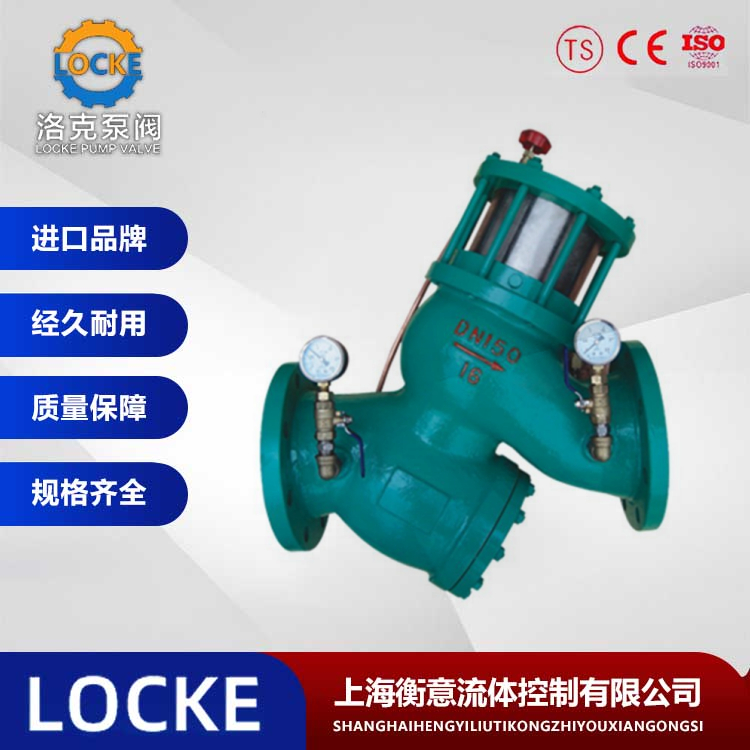 德国《LOCKE》洛克--进口过滤活塞式减压阀是一种通过调节来实现减压的智能调节阀门,可以对整个管道的减压比例及减压的长度进行调节,可以实现进口过滤活塞式减压阀的定比调节功能。其在项目当中运行过程是:当阀门从进口端给水时,水流过针阀进入主阀控制室,出口压力通过导管作用到导阀上。当出口压力高于导阀弹簧设定值时,导阀关闭。控制室停止排水,此时主阀控制室内压力升高并关闭主阀,出口压力不再升高。当阀门出口压力降到导阀弹簧设定压力时,导阀开启,控制室向下游排水。由于导阀系统排水量大于针阀的进水量,主阀控制室压力下降。进口压力使主阀开启。在稳定状态下,控制室进水、排水相同,主阀开度不变,出口压力稳定。出口压力不因进口压力变化而改变,亦不因主阀出口流量的变化而改变,安全可靠地将出口压力维持在设定值上。该阀减压精确,性能稳定、安全可靠、安装调节方便,使用寿命长。可用于生活给水、消防系统及工业给水系统。